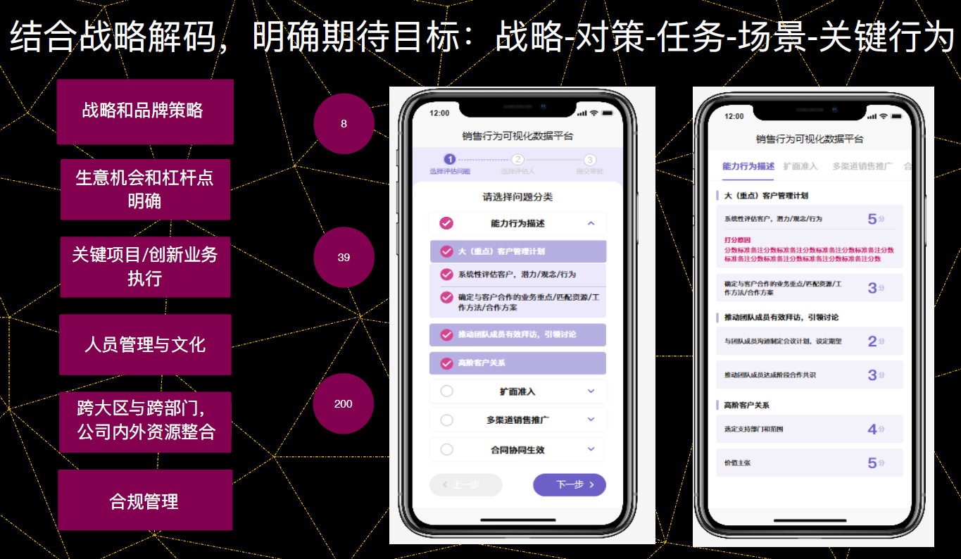 贯穿始终——领航会议:该会议接近于一个“务虚会”,用于更好地进行政策的传达和研读,帮助企业实现“上下同欲”,明确未来的目标、挑战。同时,企业会邀请跨行业专家来共同交流、探讨当前行业的变化。
